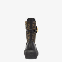 Round toe combat boots closed with laces and Fendi lettering strap. Made of black leather. Finished with jacquard FF fabric. Gold-finish metalware. Made in Italy Measurements: - Heel height : 50 mm Composition: 100% calf leather, 65% polyamide, 35% cotton, 100% resins, lining: 100% calf leather Product Code: 8T8355AHGYF0PMM