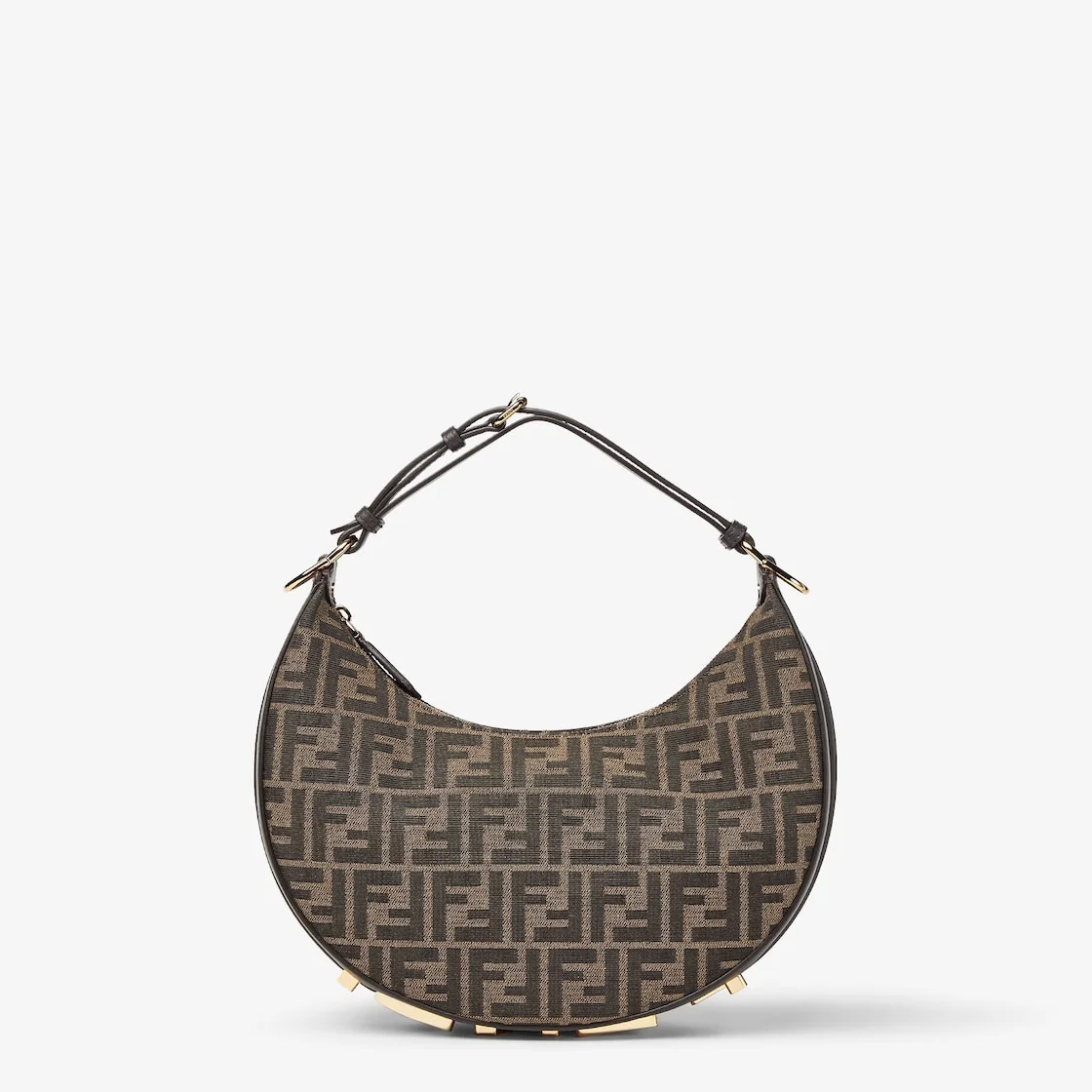 Small hobo bag made of brown FF jacquard motif fabric, decorated with vintage gold metal FENDI lettering visible when wearing the bag under the arm. Zipper closure with fabric-lined internal compartment, gold-finish metalware. Can be worn under the arm or cross-body thanks to the adjustable, detachable handle and the hooks that allow a shoulder strap to be attached. Made in Italy Measurements: - Height : 24.5 cm - Depth : 10 cm - Width : 29 cm - Weight : 1.11 kg Composition: 27% Polyester, 27% Polyamide, 27% Polyurethane, 15% Cotton, 4% Resin, 100% Calfskin, interior: 63% Cotton, 34% Polyester, 3% Acrylic Product Code: 8BR798ALP3F1I02