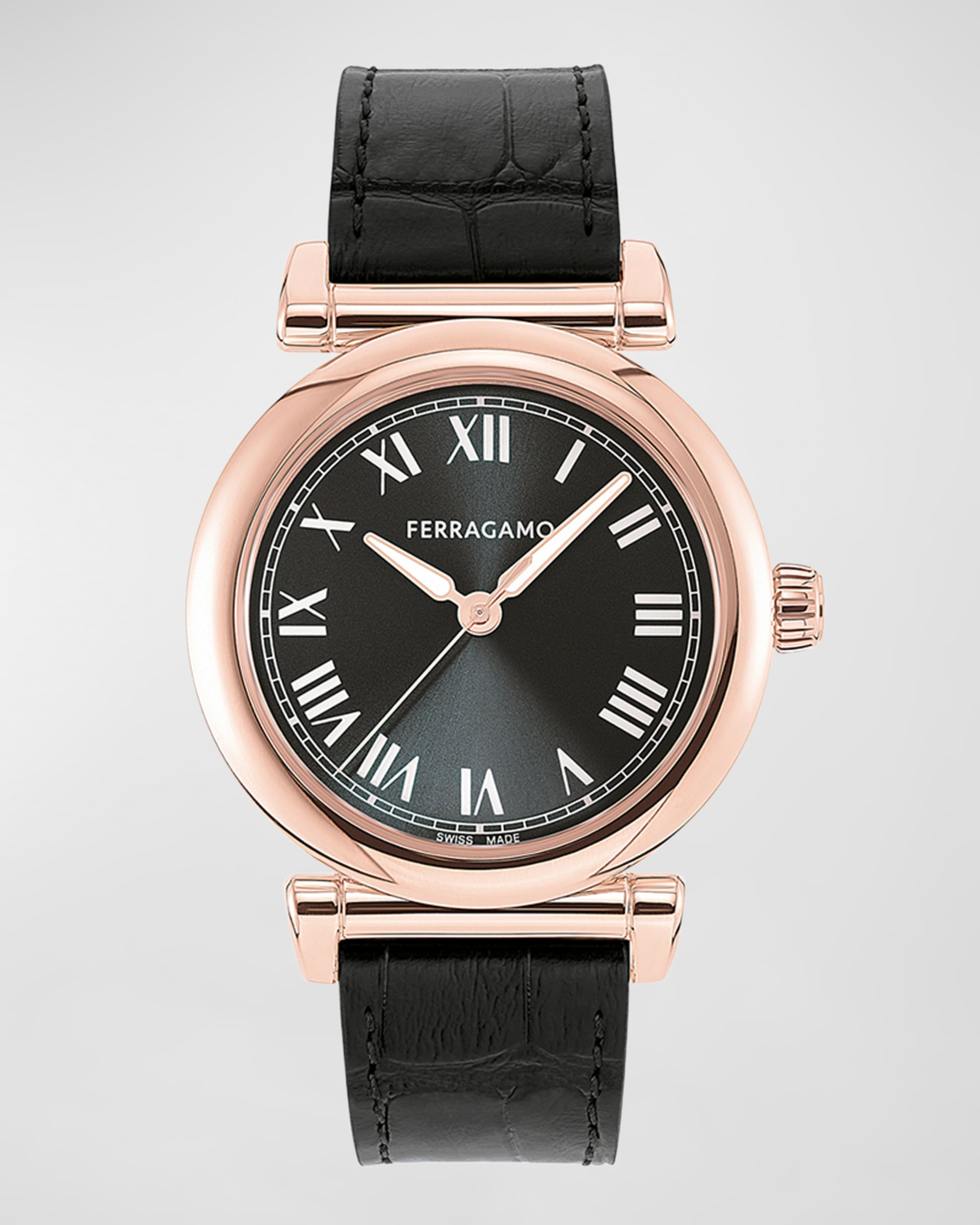 - Ferragamo Allure watch - Approx. 4.33" x 2.56" length x 0.7" width - Rose golden ion-plated stainless steel case - Black sunray dial with Roman numerals - Three-hand quartz movement - Black calf leather strap - Adjustable thorn buckle - Spot clean - Made in Switzerland Online Inquiries: NMS21_Y753U Store Inquiries: #4789584