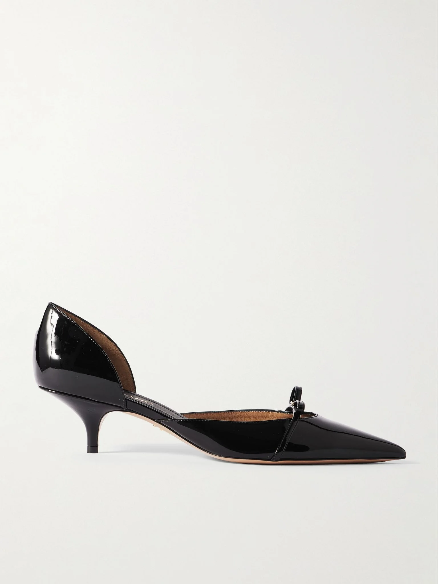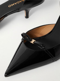 Ferragamo''s ‘Gyoia’ pumps have been crafted in Italy from glossy patent-leather and rest on low kitten heels that are practical for long days (or nights). Consider hemlines that show off the dainty bows at the pointed toes. Size & Fit - Fits true to size, take your normal size - US sizing Details & Care - Heel measures approximately 40mm/ 1.5 inches - Black patent-leather (Calf) - Slip on