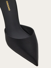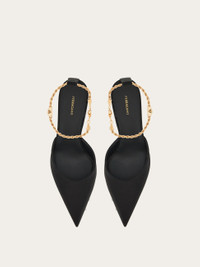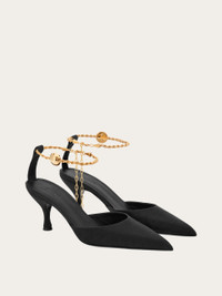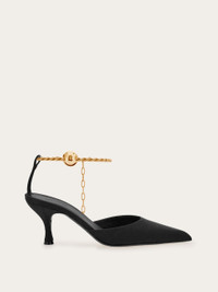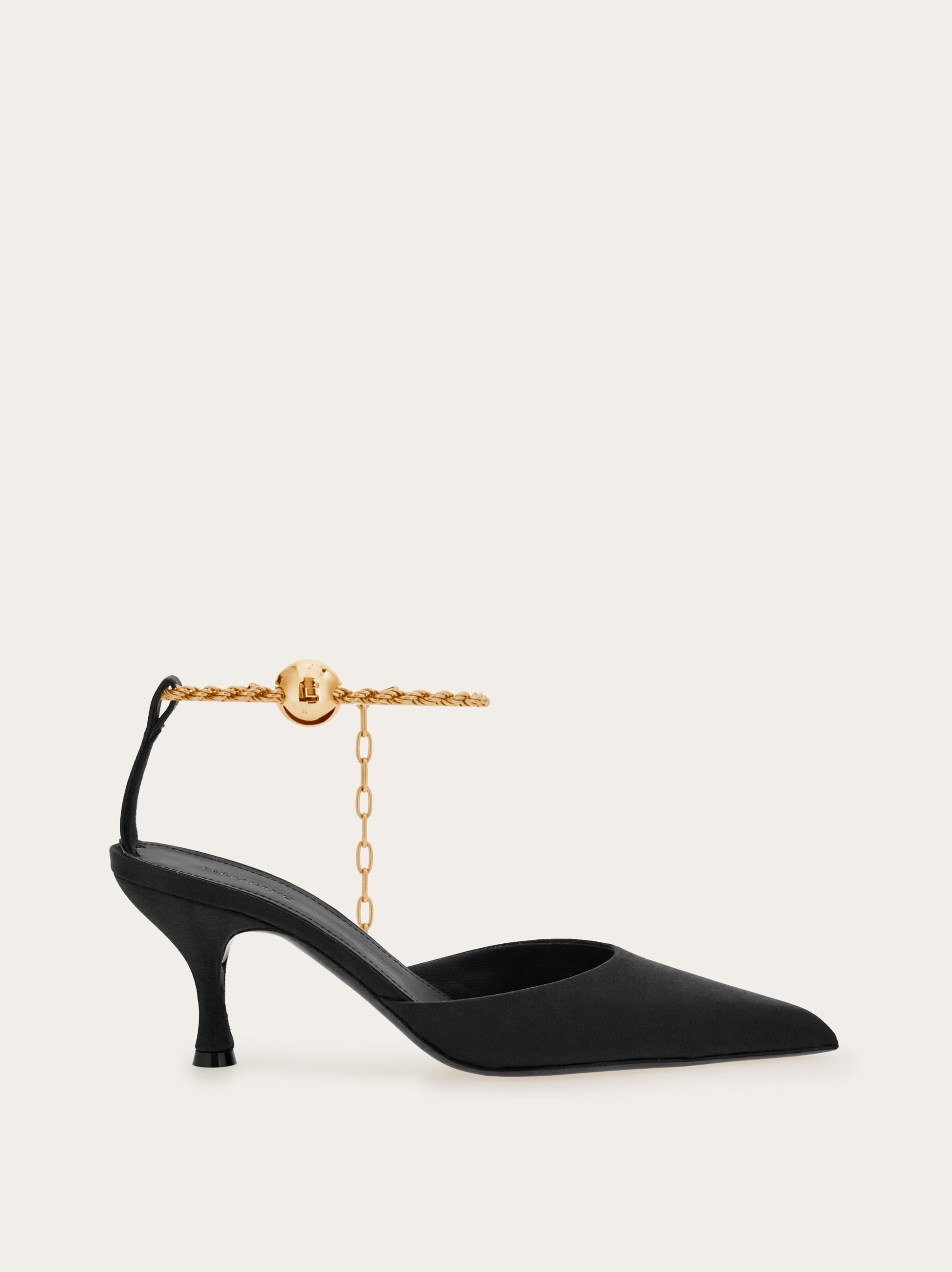 Taking contemporary sensuality to new heights, this mid heel pump has a tapered toe with squared tip. The satin upper is complemented by a golden ankle chain with an F engraved on the charm. The satin covered kitten heel has a slight tilt for an artsy edge. - Composition: fabric - Made in ITALY - Product code: 01H464 768984