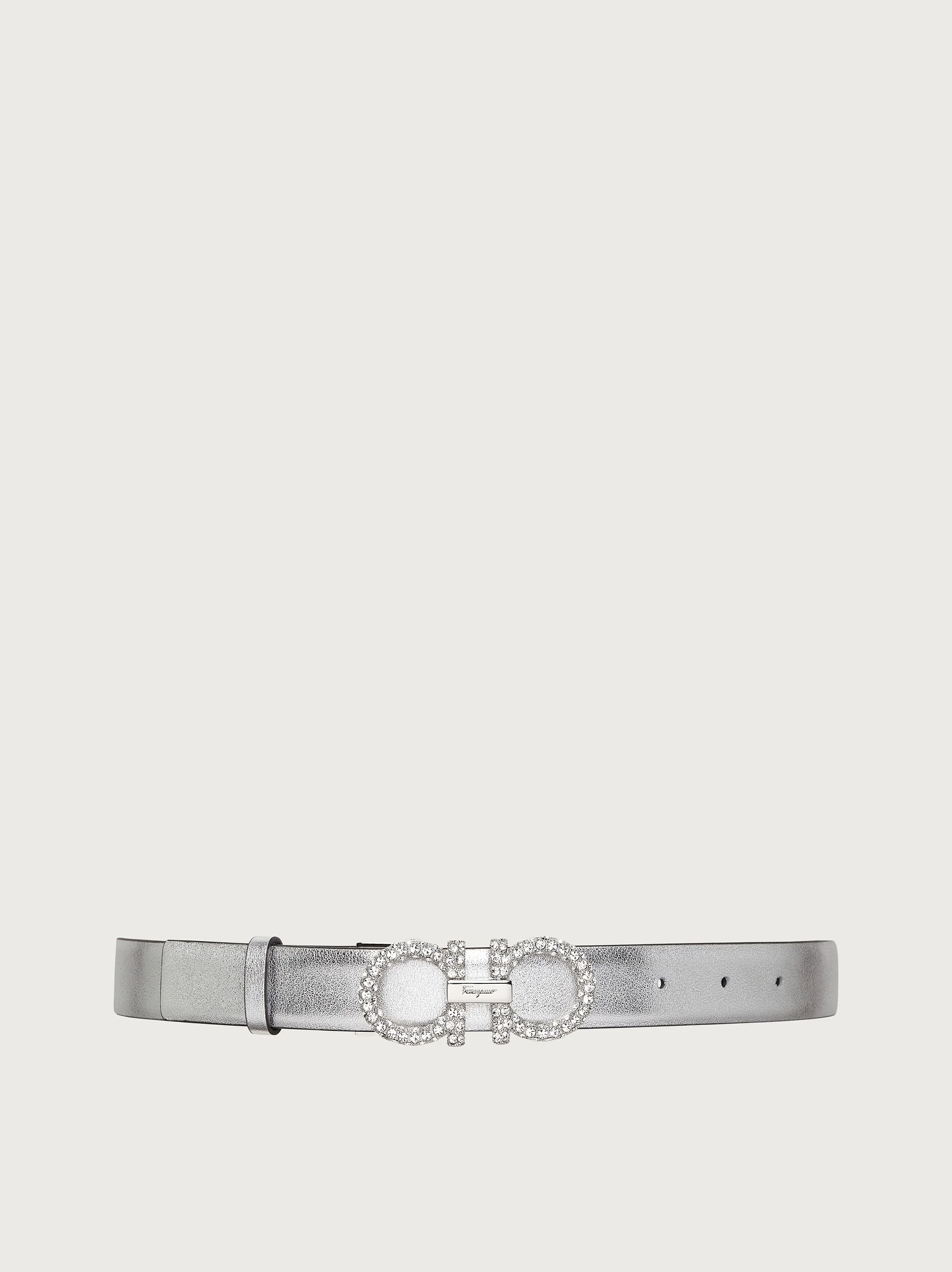 Striking details light up this leather belt for a sophisticated look that is sure to turn heads. Made of Italian calf, the leather is laminated in a cool silver hue for a super glam flair. Perfect for evening outfits, the buckle is engraved with the signature, which simply confirms its iconic status. The adjustable length allows for a more personalized fit and style. We invite you to check our size guide for more information. - height 0.9 IN - Composition: laminated calf leather - Made in ITALY - Product code: 23B727 746845