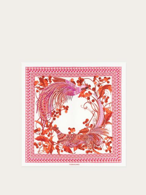 Luxurious, poetic and with elegant features, birds of paradise adorn this scarf in a pose taken from their courtship dance. Rich in symbolism, they are taken from archive motifs and repurposed with updated shapes and colors. This accessory to be matched with seasonal outfits has intense shades. - length 35.4 IN width 35.4 IN - Composition: 100% silk - Made in ITALY - Product code: 310199 780278