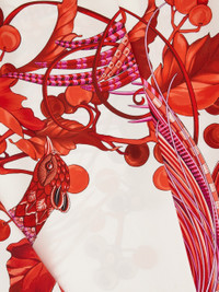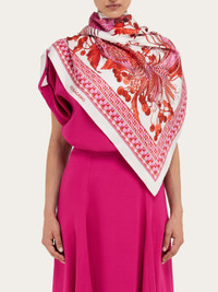Luxurious, poetic and with elegant features, birds of paradise adorn this scarf in a pose taken from their courtship dance. Rich in symbolism, they are taken from archive motifs and repurposed with updated shapes and colors. This accessory to be matched with seasonal outfits has intense shades. - length 35.4 IN width 35.4 IN - Composition: 100% silk - Made in ITALY - Product code: 310199 780279