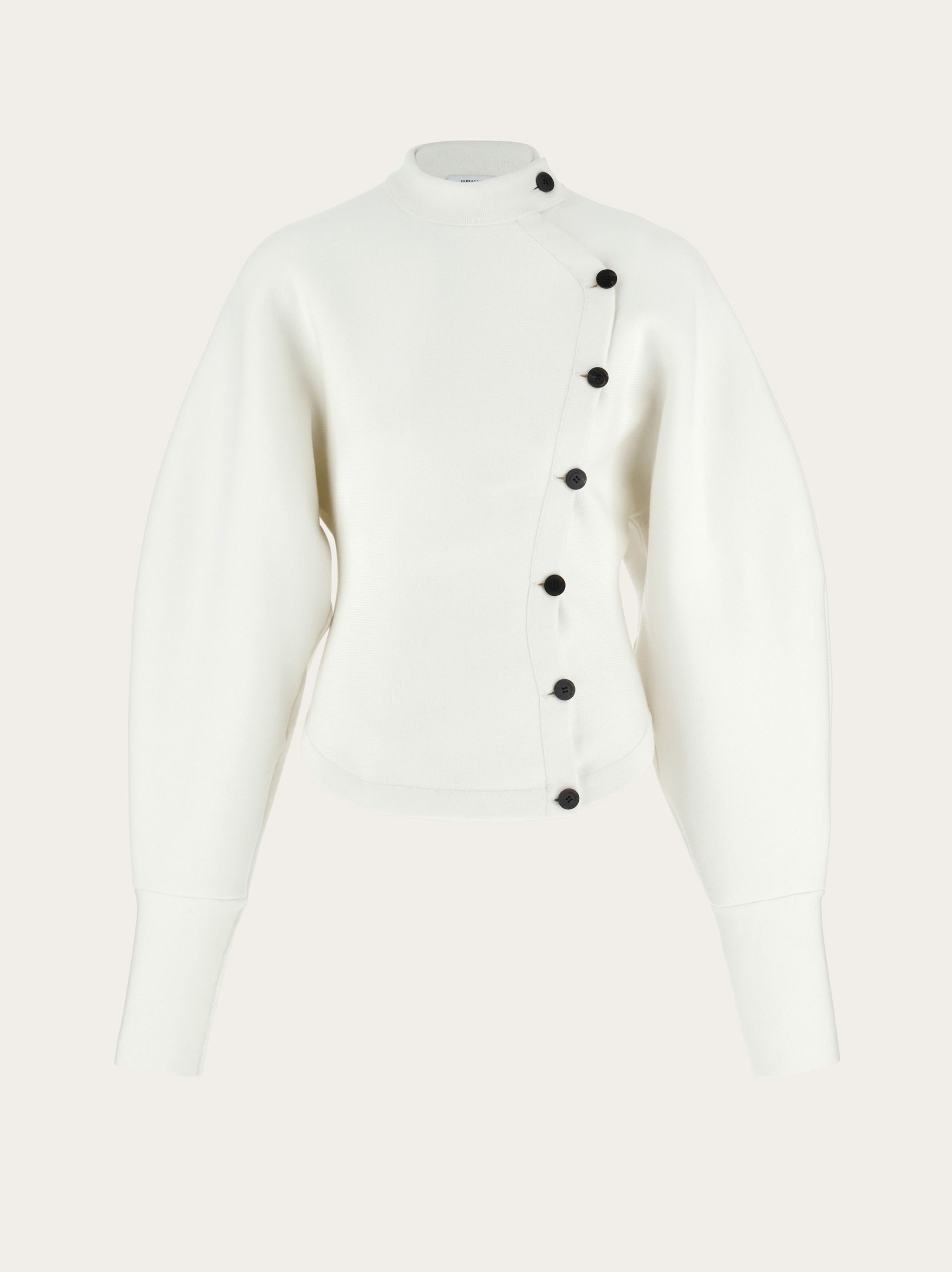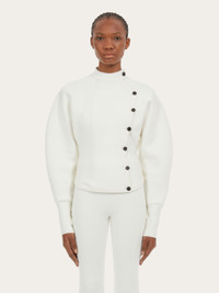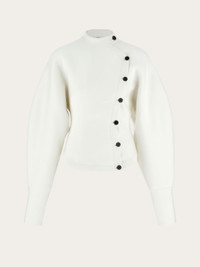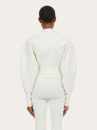 New concept knitted jacket, made of compact technical wool. The feminine line is sinuous on the bust, with a back basque and darts, while the voluminous sleeves are cinched at the wrist by a high cuff. - Composition: 33% wool, 58% nylon, 2% elastane, 7% viscose - Product code: 111998 767267 - Made in ITALY