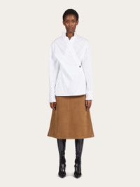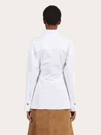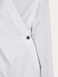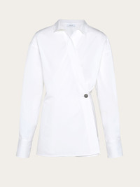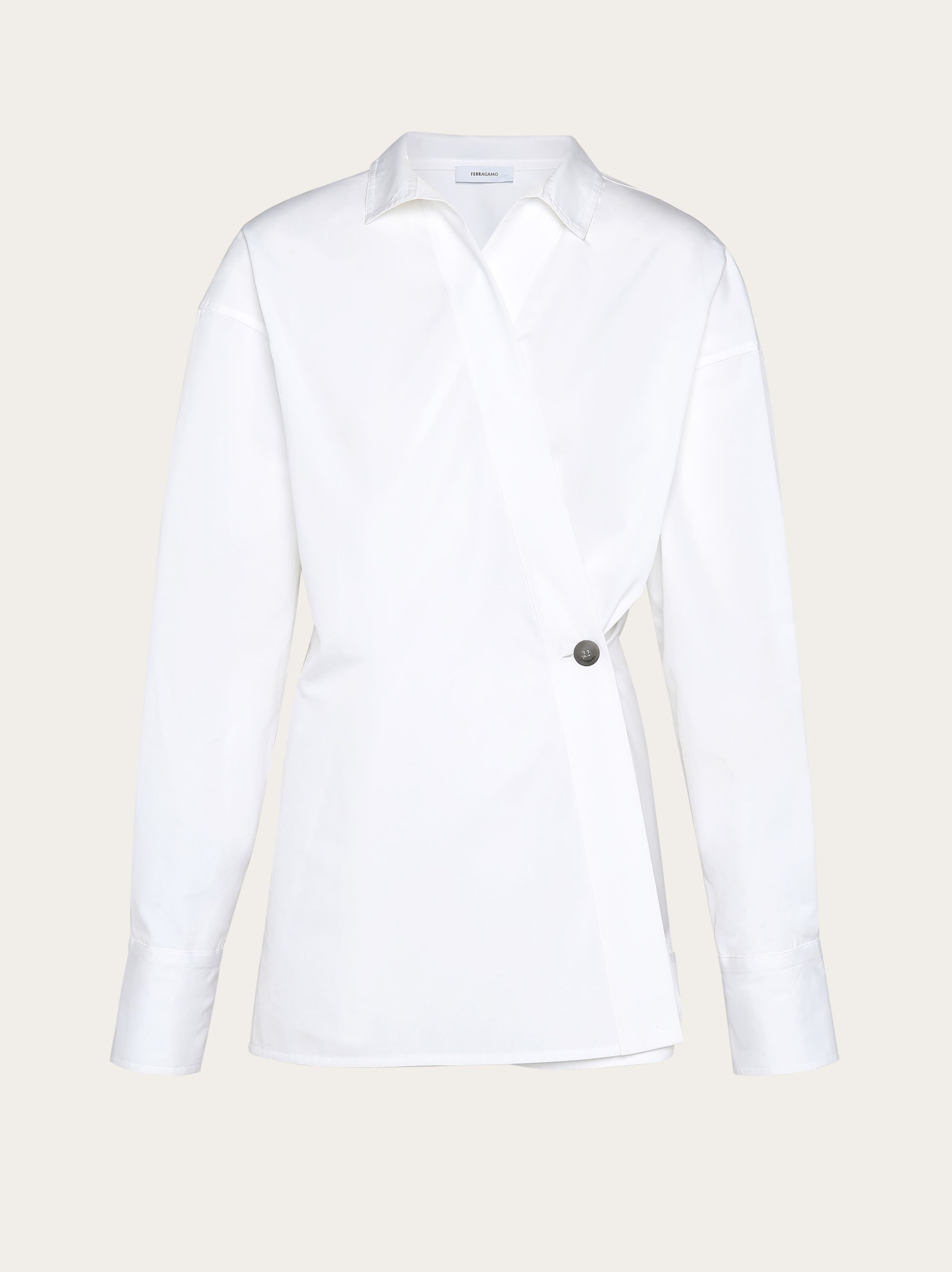 Pure cotton popeline shirt with a mandarin collar and crossover front with one visible button on the side. The hidden inside button secures the front, leaving the feminine cut to drape softly to a drop shoulder and fitted waist, and high cuffs that fasten with a single button. Straight back yoke. - Composition: 100% cotton - Product code: 13C968 770447 - Made in ITALY