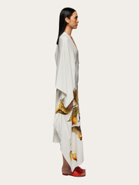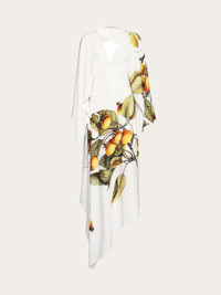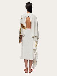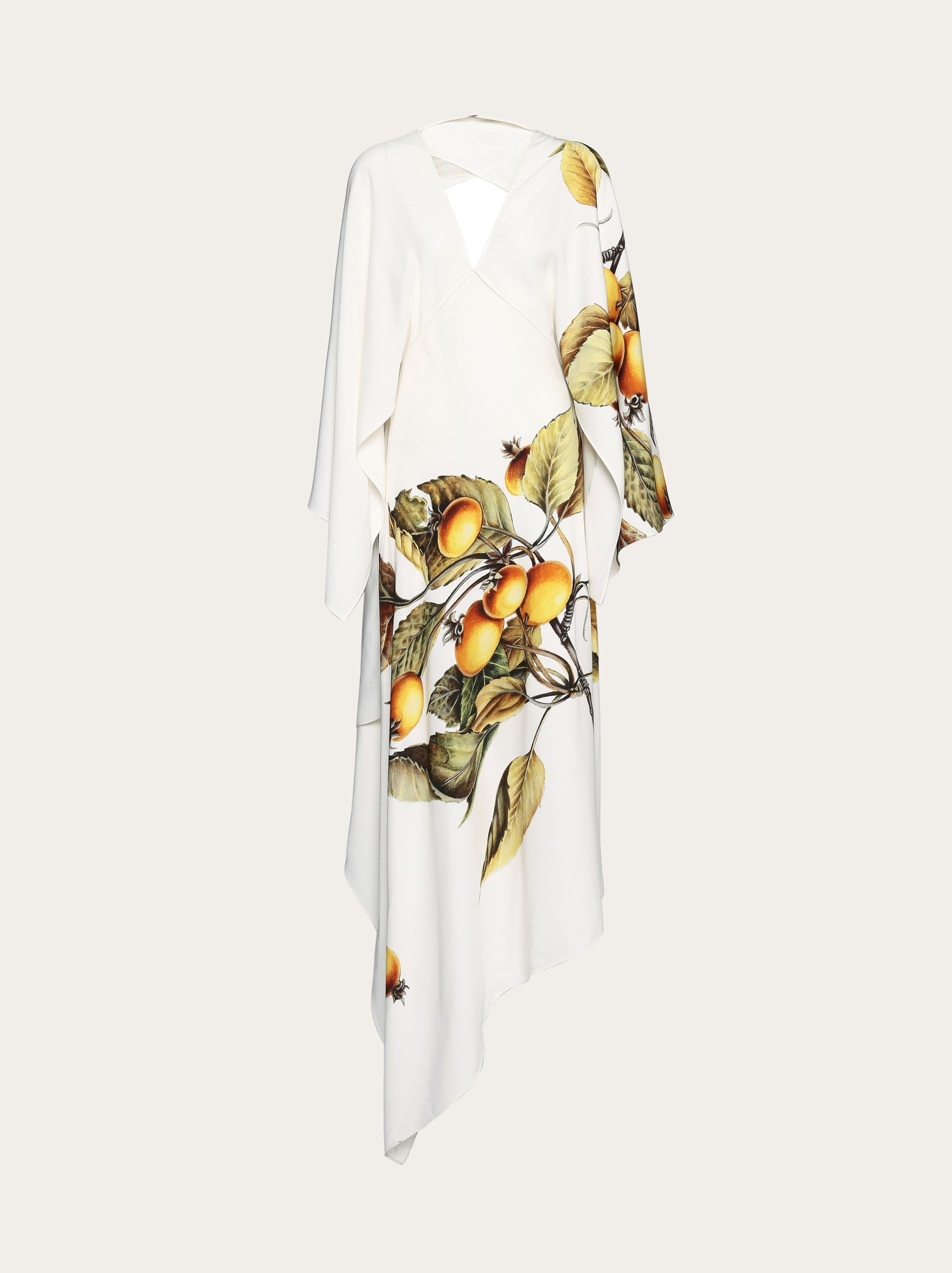 Cady viscose was selected to make this dress for the perfect balance of structure and weighted drape. Contemporary and super feminine, the slightly elasticated fabric is printed with a botanical motif that runs throughout this season’s collection. The halterneck silhouette has a completely open back with a sash that falls below the waist at the front, which can also be tied behind the back. Asymmetrical hem and red top stitching along the edge. Side zip fastening. - Composition: 97% viscose, 3% spandex - Product code: 13C986 771087 - Made in ITALY