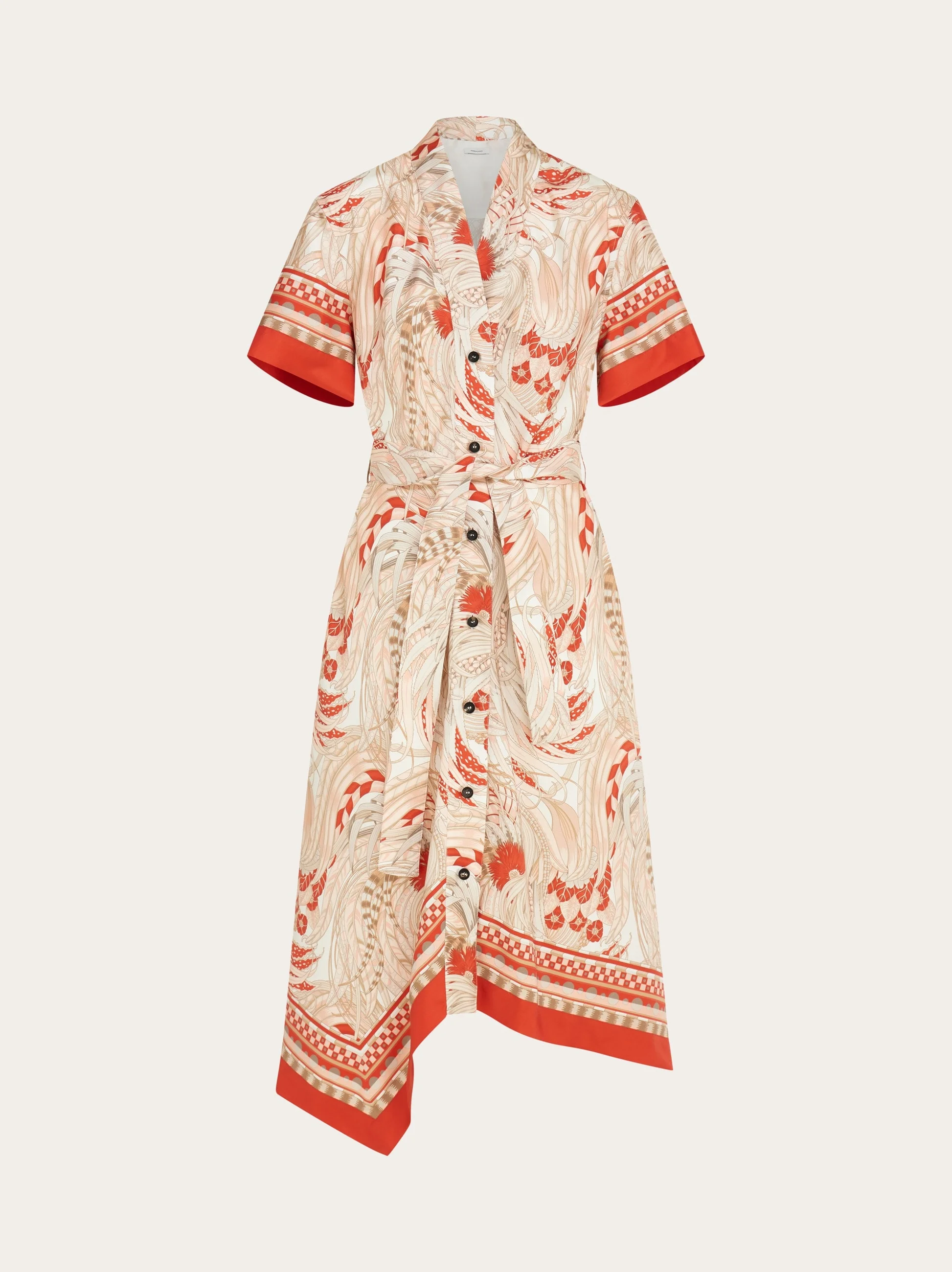 Crafted from pure organic silk, this short-sleeved dress enchants with its airy feel and effortless fluidity. The gently flared silhouette, defined by an asymmetrical hemline shorter at the front and softer at the back, creates a graceful movement that subtly elongates the figure. A refined V-neckline frames the decollete, while the scarf‑inspired print adds an elegant, distinctive touch. The coordinated belt accentuates the waist, enhancing the feminine proportions with polished balance. - Composition: 100% silk - Made in ITALY - Product code: 13I226 792534