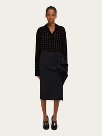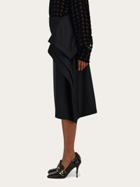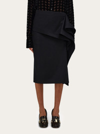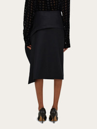 Conceptual evolution of the pure wool flannel skirt with a turned up peplum at the waist that duets with the scarf detail. The large diagonal panel that crosses the waist gathers at the left side where voluminous folds gently drape and swoosh with every step. Pair with collection sandals and cashmere for an unexpected combination that is both effortless and chic. - Composition: 100% pure virgin wool - Model measurements: Height 5' 9"/175 cm; Bust 30"/76 cm; Waist 24"/61 cm; Hips 34½"/87 cm - Model wearing: 38/XS - Made in ITALY - Product code: 13H319 785522