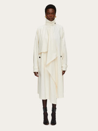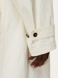 A high-end evolution of the classic trench, with an oversized fit and rich details. The shirt collar is fastened with a ribbon and custom double horn buttons. On the front, an asymmetrical panel is loosely draped over the placket to create a captivating volume that is both modern and timeless. The conical sleeves have wide cuffs that fasten at the wrist via belt straps, and the large storm flap at the back echoes the voluminous outline. Central back vent. - Composition: 100% linen - Model measurements: Height 5' 10"/178 cm; Bust 31½ "/80 cm; Waist 23½"/60 cm; Hips 34 "/88 cm - Model wearing: 38 - Made in ITALY - Product code: 13E804 773329