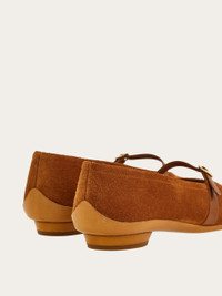 Designed in 1954 for Audrey Hepburn, this suede ballet shoe is a symbol of the fashion history and a testament to Ferragamo's impeccable craftsmanship. It features a delicate kidskin strap and a buckle that add a touch of sophistication. The low, oval heel and shell-shaped sole draw inspiration from Native American opanke moccasins, merging comfort with style. - Composition: suede - Made in ITALY - Product code: 01I092 774338