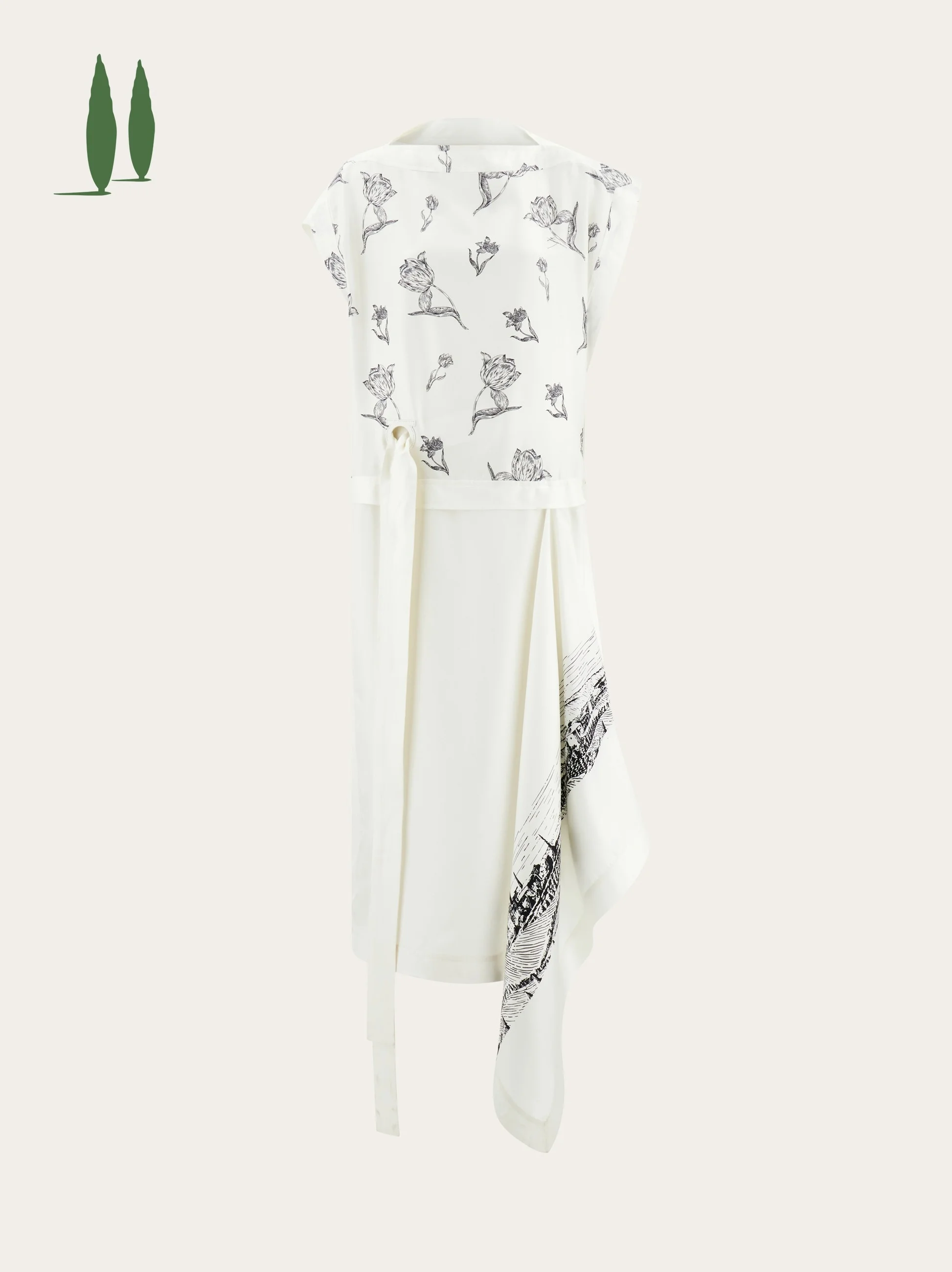 The contrasting prints that adorn this unique dress are taken from an ancient lithograph. The motif enhances the romantic feel of the silk, cut with a boat neck and billowing handkerchief skirt. An expression of the Ferragamo creative spirit and care for the environment, this romantic piece is completed by a leather trimmed Gancini eyelet through which the waist sash elegantly slides. This garment is made entirely of organic silk. The print is made using Bio Black TXTM, a bio based high performing water-based pigment. - Composition: 100% organic silk - Model measurements: Height 5' 11"/180 cm; Bust 33"/84 cm; Waist 23½"/60 cm; Hips 34½"/88 cm - Model wearing: 38/XS - Made in ITALY - Product code: 13H471 786946