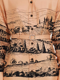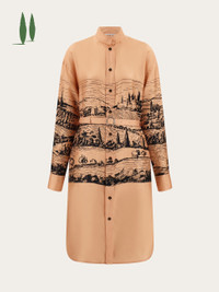 The essence of luxury: a balance between nature and craftsmanship. Sustainable silk dress adorned with an antique print of a typical Tuscan landscape from an ancient lithograph. A tonal fabric belt cinches the silhouette. - Composition: 100% organic silk - Model measurements: Height 5' 11"/180 cm; Bust 33"/84 cm; Waist 23½"/60 cm; Hips 34½"/88 cm - Model wearing: 38/XS - Made in ITALY - Product code: 13H473 786982