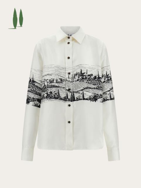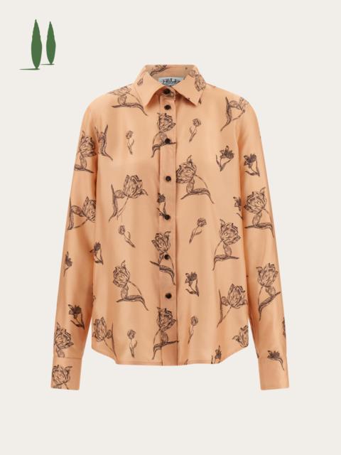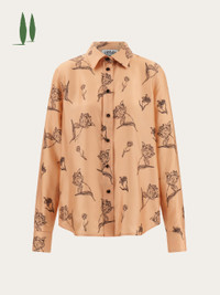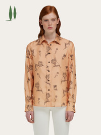 An exclusive piece from the Back to Earth collection, this organic silk shirt celebrates the beauty of nature. The lithograph printed design is set on a minimal silhouette whose clean lines leave room for its message: a return to nature. This garment is made entirely of organic silk. The print is made using Bio Black TXTM, a bio based high performing water-based pigment. - Composition: 100% organic silk - Model measurements: Height 5' 11"/180 cm; Bust 33"/84 cm; Waist 23½"/60 cm; Hips 34½"/88 cm - Model wearing: 38/XS - Made in ITALY - Product code: 13H469 786983