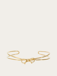 A slender bangle, a golden thread that gently wraps around the wrist—bringing a romantic flair to your look. This new Ferragamo bracelet captures the grace of a bow with delicate charm, finished with a small central plate inspired by the iconic Vara silhouette. - Composition: brass - Made in ITALY - Product code: 760954 791734