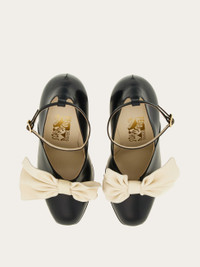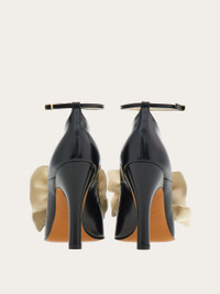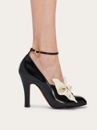 This black brushed calfskin pump is a symbol of timless glamour. With a 10 cm heel, featuring an ankle strap and adorned with an asymmetric magnolia nappa bow, this pump was worn by the American actress Gloria Swanson in the movie "Sadie Thompson", directed in 1928 by Raoul Walsh. A devoted customer of Salvatore Ferragamo since the Hollywood Boot Shop days, Greta Swanson chose this elegant decollete, bringing together the history of Hollywood with the extraordinary craftsmanship of Salvatore Ferragamo. - Composition: kidskin - Made in ITALY - Product code: 01I097 772435