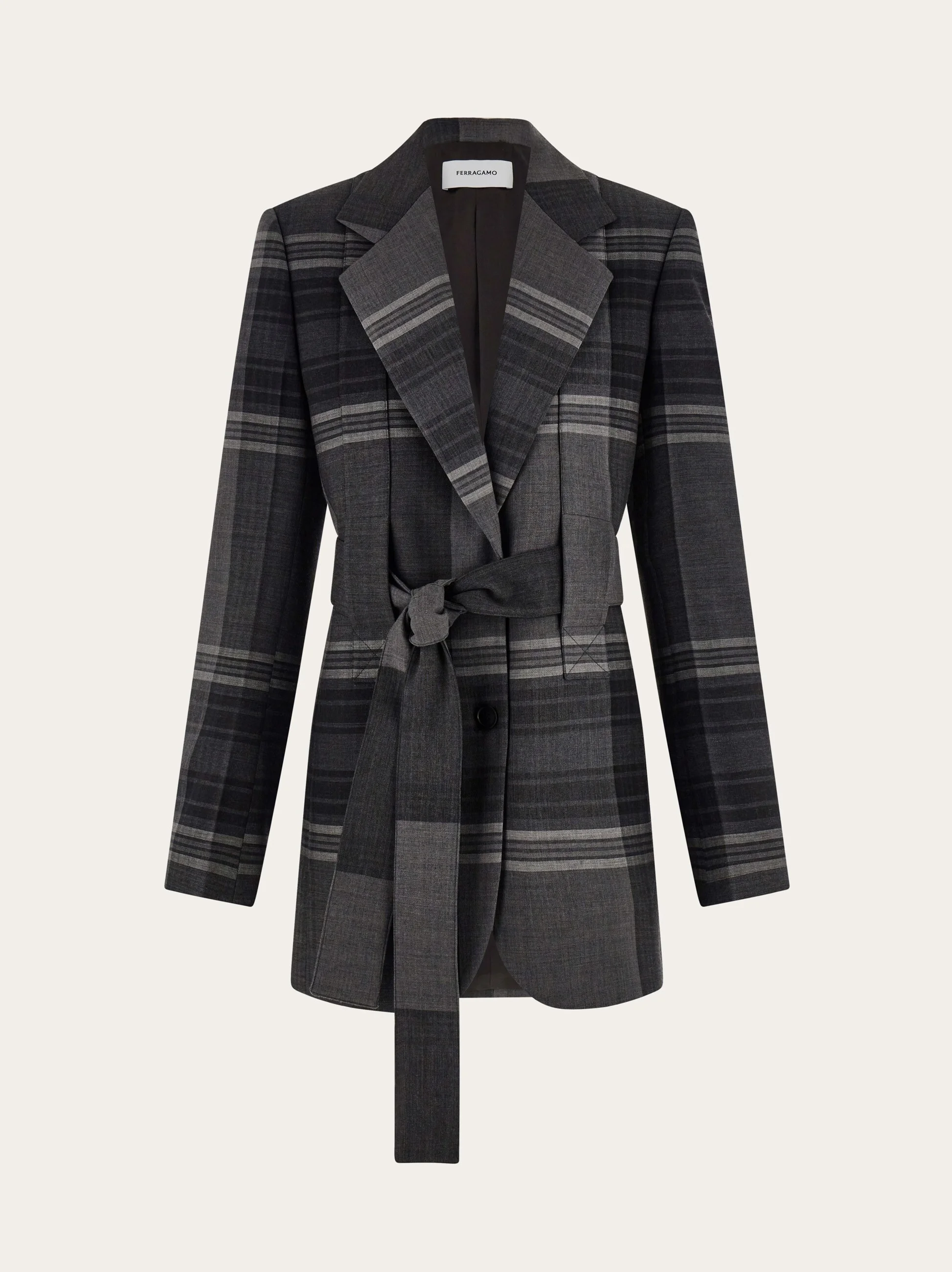 A new take on the single-breasted blazer. Cut from pure virgin wool with a touch of silk this unique silhouette features a tartan motif. The feminine outline is emphasized by a deep lapel and tonal fabric belt with wide loops. Lined. - Composition: 98% pure virgin wool, 2% silk - Model measurements: Height 5' 10"/178 cm; Bust 32 / 81cm; Waist 25"/63 cm; Hips 34½"/88 cm - Model wearing: 38/XS - Made in ITALY - Product code: 13G993 785311