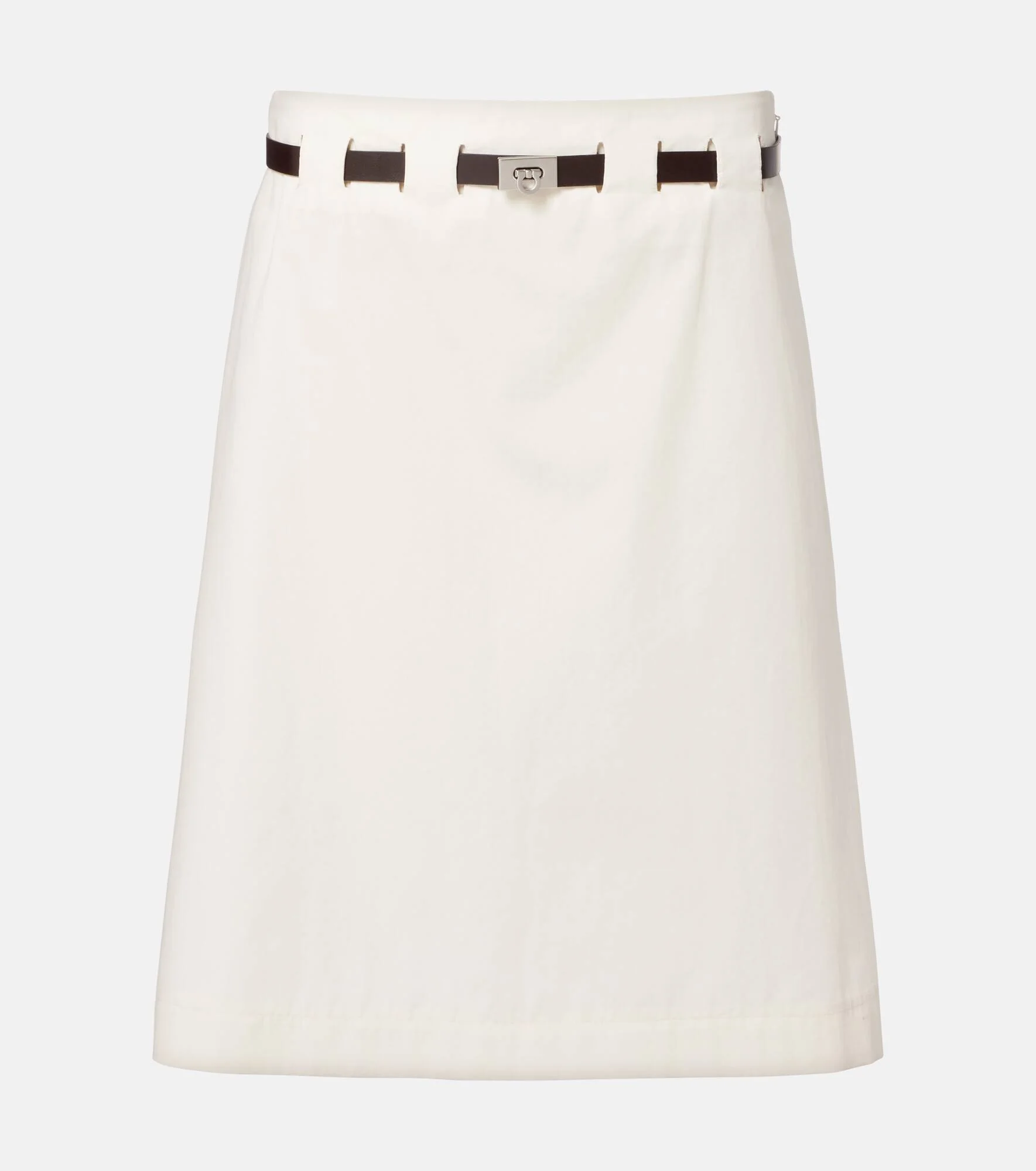 This A-line miniskirt features a smooth front, intricate back pleats, embroidered eyelets, and a Gancio buckle belt. Side slits add a modern touch, while the cotton-silk blend embodies Ferragamo’s signature elegance. Product Details - Material: 91% cotton, 9% silk - Care instructions: dry clean - Made in Italy - Color: white - Designer color name: Parchment - Details: 100% lamb leather - Contains non-textile parts of animal origin - Detachable belt - Closure: concealed zipped side - Item number: P01120529 Size & Fit - Fits large to size - we recommend trying one size smaller - Adjustable at the waist - Non-stretchy fabric - The model seen in the picture is 178cm-5'10" and wearing a size IT 38
