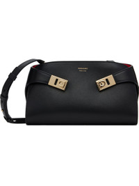 Vegetable-tanned buffed calfskin shoulder bag. · Adjustable and detachable crossbody strap · Flip-clasp straps and logo stamp at face · Zip closure · Card slots at interior · Buffed leather lining · Gold-tone hardware · H5.5" x W9.25" x D2.5" Supplier color: Black/Flame Red Calfskin. Made in Italy 252270F048010