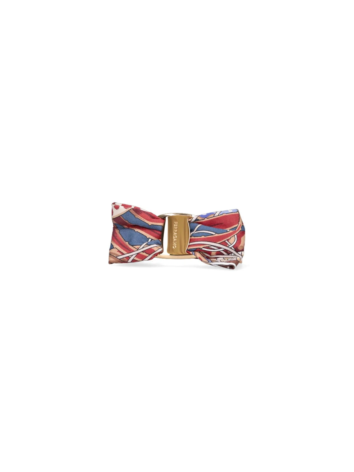 FERRAGAMO "VARA" BOW CLASP IN MULTICOLOR SILK AND COTTON, BOW DETAIL, LOGO EMBOSSED ON GOLD BRASS ON THE FRONT, BOW CLOSURE ON THE BACK. PRODUCT INFO PRODUCT CODE 791464001 COMPOSITION: 40% SILK, 20% COTTON, 20% VISCOSE, 10% PLASTIC, 10% BRASS MADE IN: ITALY