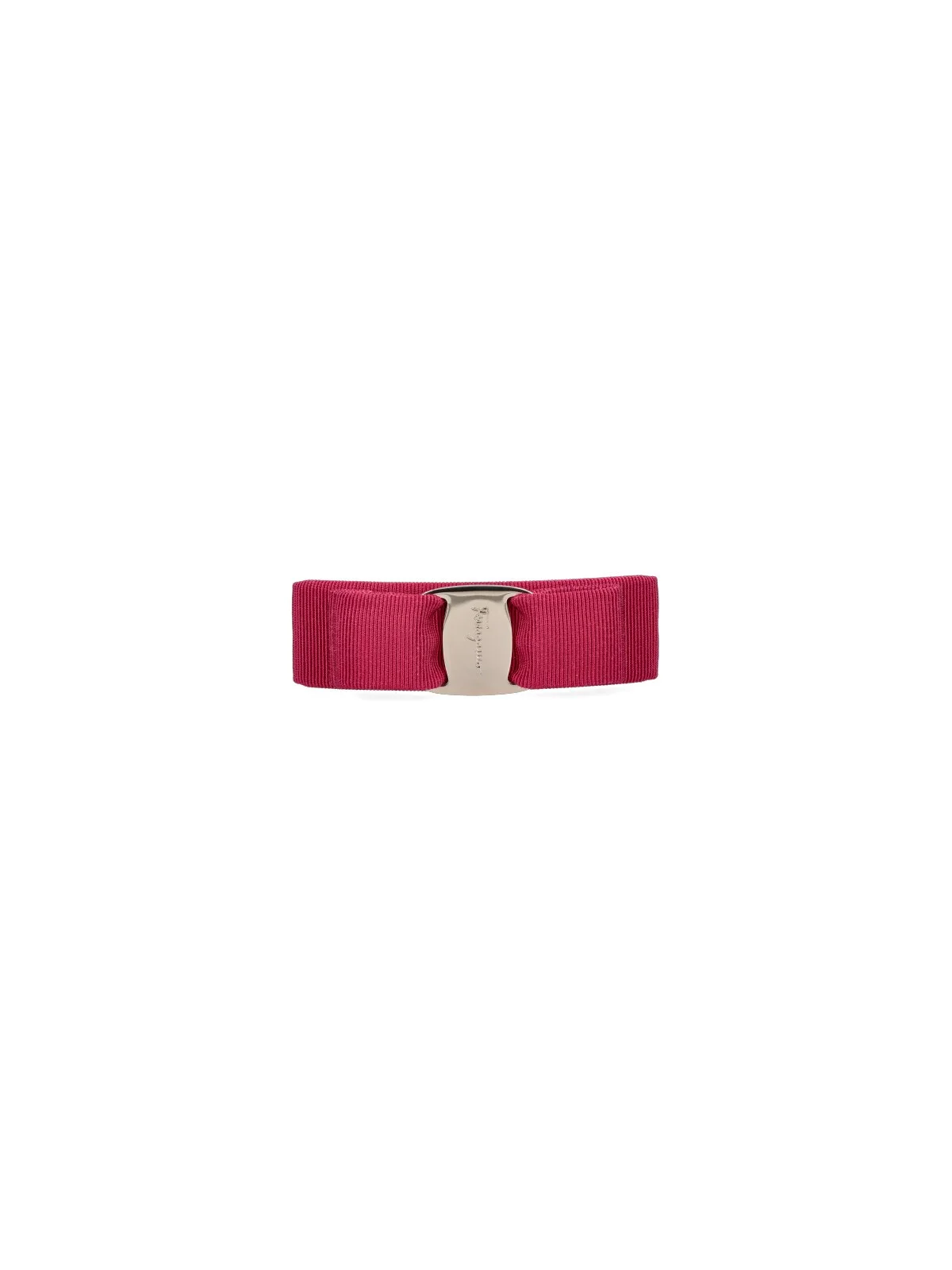 FERRAGAMO "VARA" BOW CLASP IN RED FABRIC WITH BOW ON THE FRONT, EMBOSSED LOGO ON GOLD BRASS ON THE FRONT. PRODUCT INFO PRODUCT CODE 791458120 COMPOSITION: 35% COTTON, 35% RAYON, 15% PLASTIC, 15% BRASS MADE IN: ITALY