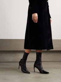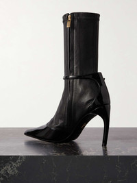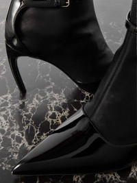 EDITORS'NOTES Ferragamo's 'Britt' ankle boots are cleverly designed to resemble point-toe pumps paired with socks. Made in Italy from a combination of smooth and patent-leather, they have a sculptural curved heel and a slim, buckle-fastening ankle strap. The side zipper ensures you can get them on and off with ease. SIZE & FIT - Fits true to size, take your normal size - US sizing DETAILS & CARE - Heel measures approximately 85mm/ 3.5 inches - Black leather (Lamb) - Concealed zip fastening along side, buckle-fastening ankle strap
