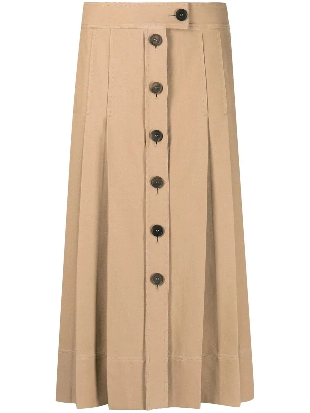 buttoned-up pleated skirt Salvatore Ferragamo offers timeless elegance with this midi skirt, boasting a fully pleated design in a soft sesame beige hue. Made in Italy Composition Cotton 100% SIZE & FIT Model measurements Height 5 ft 10 in(1.78 m) Bust/Chest 32.28 in(82 cm) Hips 35.03 in(89 cm) Waist 23.22 in(59 cm) FittingInformation This piece fits true to size. We recommend you get your regular size Designed to be fitted at the waist and hips, loose over the leg Made with a mid-weight non-stretch fabric Washing instructions Dry Clean Only