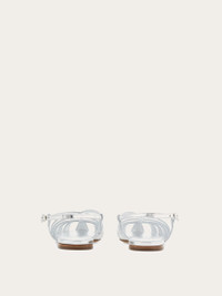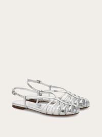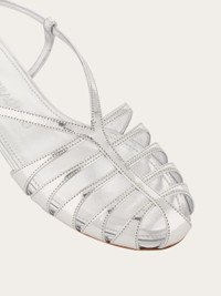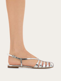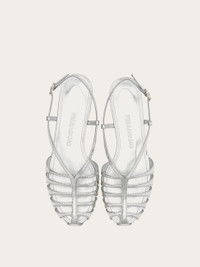 Super glam caged sandal inspired by the iconic Rainbow shoe. The laminated leather cage construction securely wraps the toes and the ankle strap is fastened by a tonal Gancio buckle. The tonal insole and rubber heel complete the design. - Composition: laminated calfskin - Made in ITALY - Product code: 01K978 790121