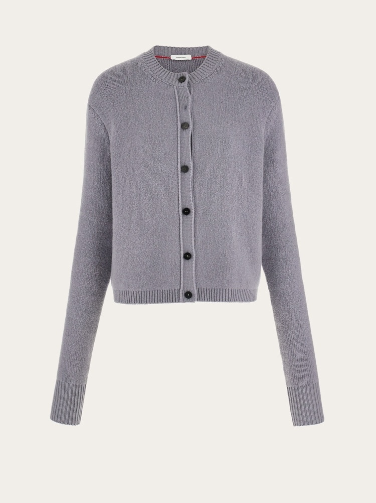 Clean cut cardigan with chic detailing. The ribbed collar, cuffs and hem add a contemporary twist to this classic cover up that features large black custom buttons for an exclusive finish. Small custom metal tab at the back of the neck. - Composition: 90% cashmere, 10% nylon - Made In ITALY