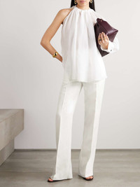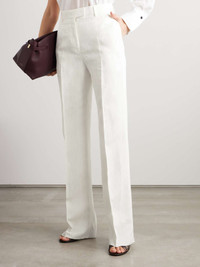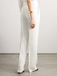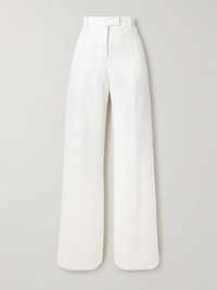 EDITORS'NOTES Ferragamo's pants make such a polished starting point for any summer outfit. Woven with linen, they're cut in a wide-leg shape and have sharp creases through the legs for an elongating effect. Try them as part of an all-white look with contrasting accessories and jewelry. SIZE & FIT Model measurements: - Fits true to size, however those who are between sizes should take the smaller size - High-rise, cut for a wide-leg fit - Mid-weight, non-stretchy fabric - Model is 175cm/ 5'9" and is wearing an IT 38 - Bust: 78cm/ 31" - Waist: 62cm/ 24.5" - Hip: 83cm/ 32.5" DETAILS & CARE - White canvas - Concealed hook and zip fastening at front - 54% viscose, 46% linen - Dry clean
