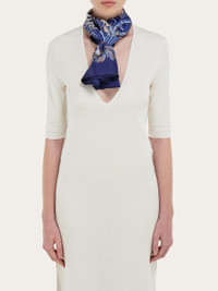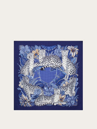 An iconic figure in Ferragamo’s visual universe, the cheetah is reimagined in this pure silk twill scarf. Evoking a deep connection to nature, the allure of the jungle and its bold beauty comes alive in a vivid composition of exotic foliage and wild cats captured in dynamic poses. Vibrant hues stand out against a geometric backdrop, a striking contrast that highlights the print’s modern edge. - length 35.4 IN width 35.4 IN - Composition: 100% silk - Made in ITALY - Product code: 310228 789464
