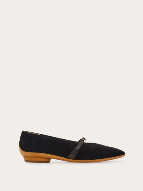 Originally envisioned by Salvatore Ferragamo in 1958, this suede ballet flat model was created for the legendary actress Marilyn Monroe. Adorned with a delicate tie and featuring a distinctive shell-shaped sole, the ballet flat is a combination of vintage charm and timeless sophistication. - Composition: goatskin - Made in ITALY - Product code: 01I093 772453