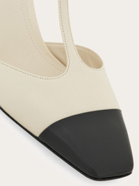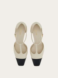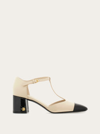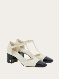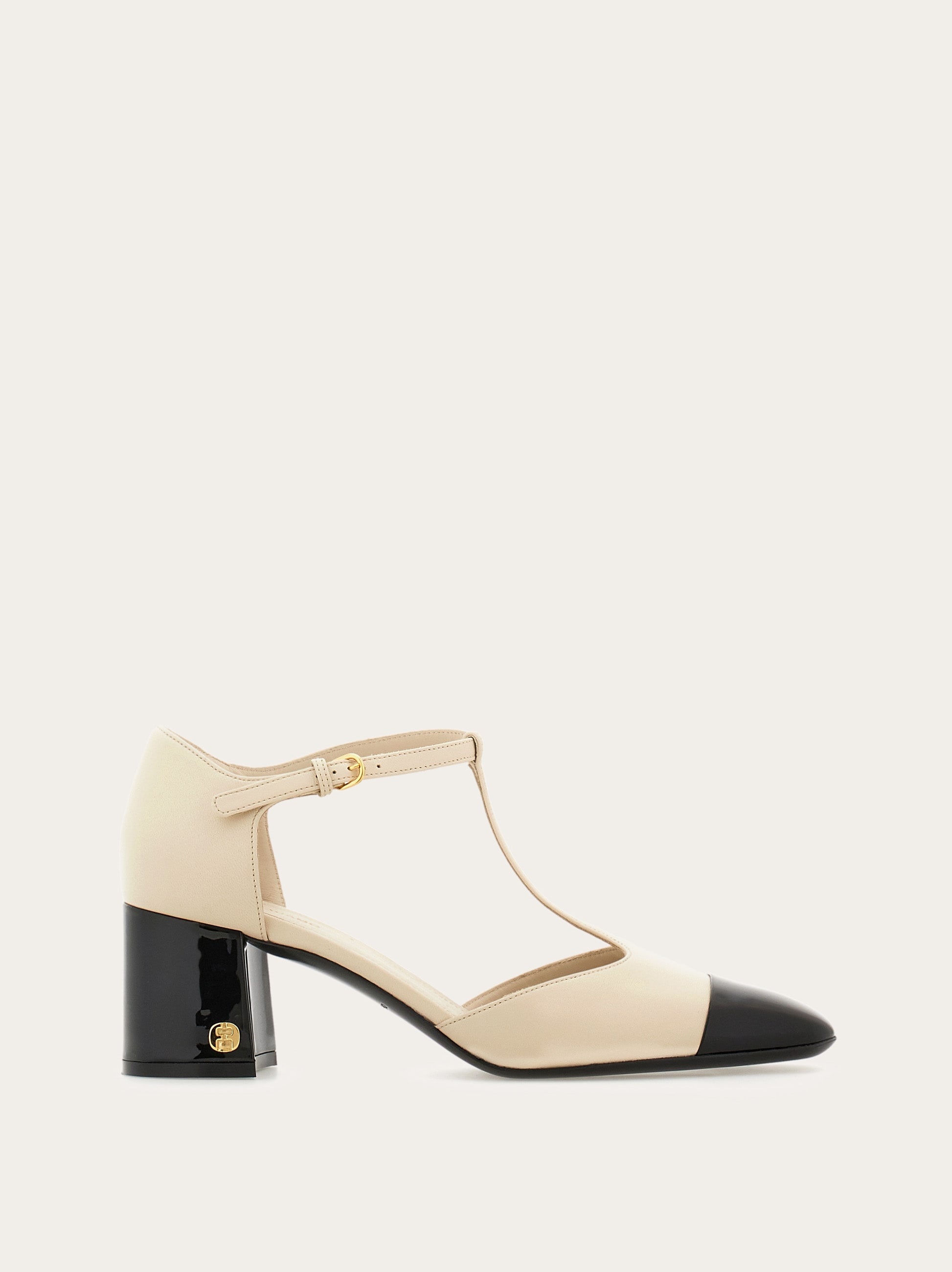 A classic silhouette with a contemporary dynamic. Made of soft nappa leather with patent accents, this high shine T-bar shoe has an elongated upper with a squared toe, and a slim strap that fastens at the ankle via a golden buckle. A small. golden double F tab is placed on the covered block heel. - Composition: nappa and patent leather - Made in ITALY - Product code: 01I689 776515