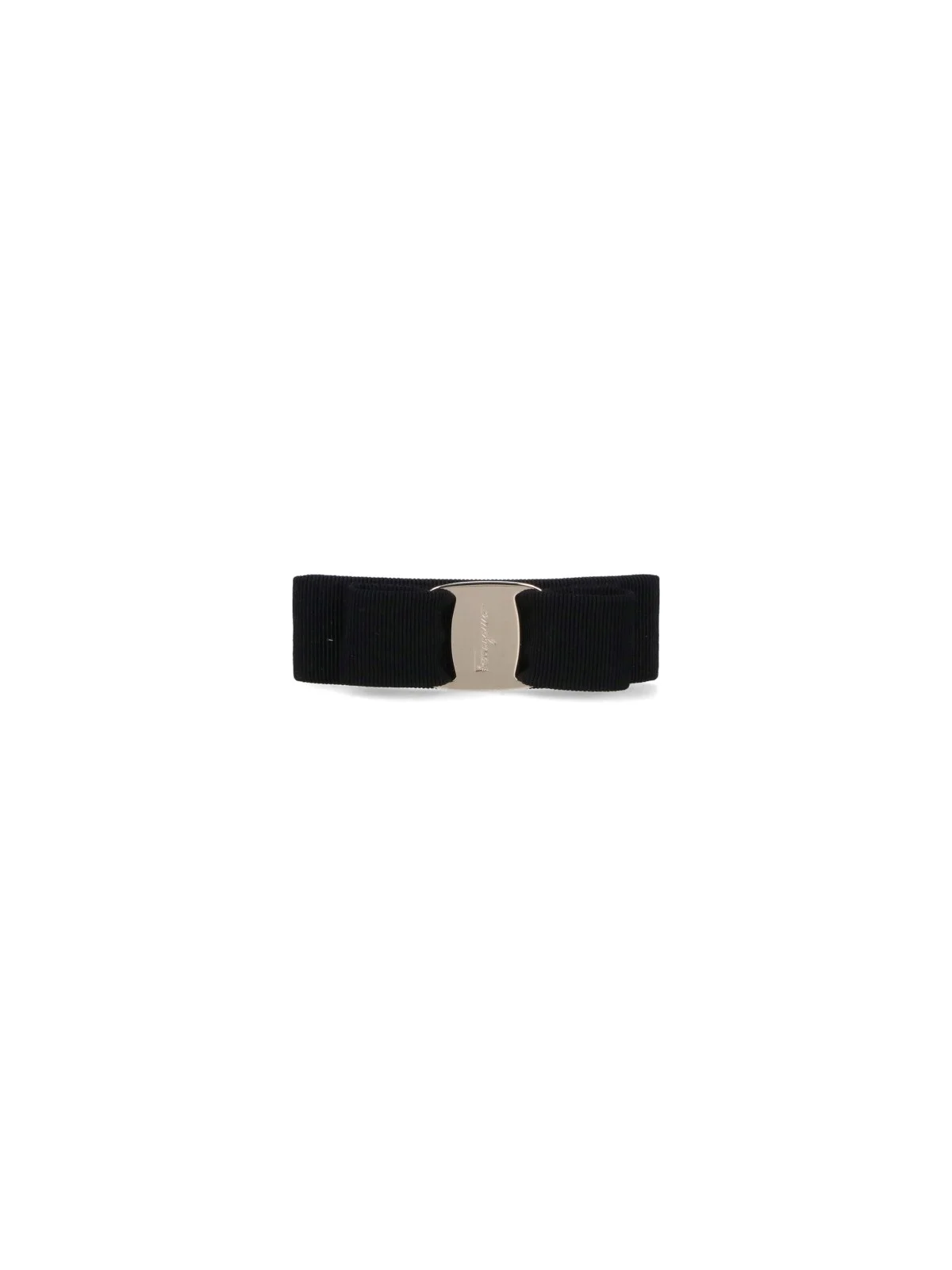 FERRAGAMO "VARA" BLACK CLASP WITH GOLD METAL LOGO, BACK CLIP CLOSURE. PRODUCT INFO PRODUCT CODE 771551001 COMPOSITION: 40% VISCOSE, 24% COTTON, 16% SILK, 10% LEATHER, 5% BRASS, 5% PLASTIC MADE IN: ITALY - TRIMS: 100% BRASS