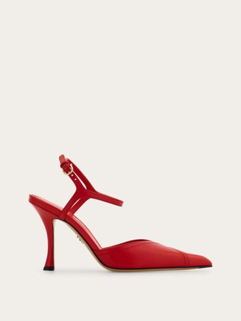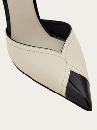 Set on a 9.5cm heel, this Ferragamo pump features a sophisticated play of glossy, patent inlays which the soft kid leather appears to unzip and reveal. Double stitching highlights the cut, with a pointed tip and elegant strap that fastens at the ankle via a golden buckle. The eye catching heel is straight on one side and curved on the other, for a decidedly sensual finish. - Composition: kid leather and patent calfskin - Made in ITALY - Product code: 01J363 779820