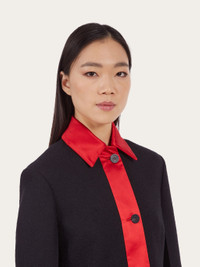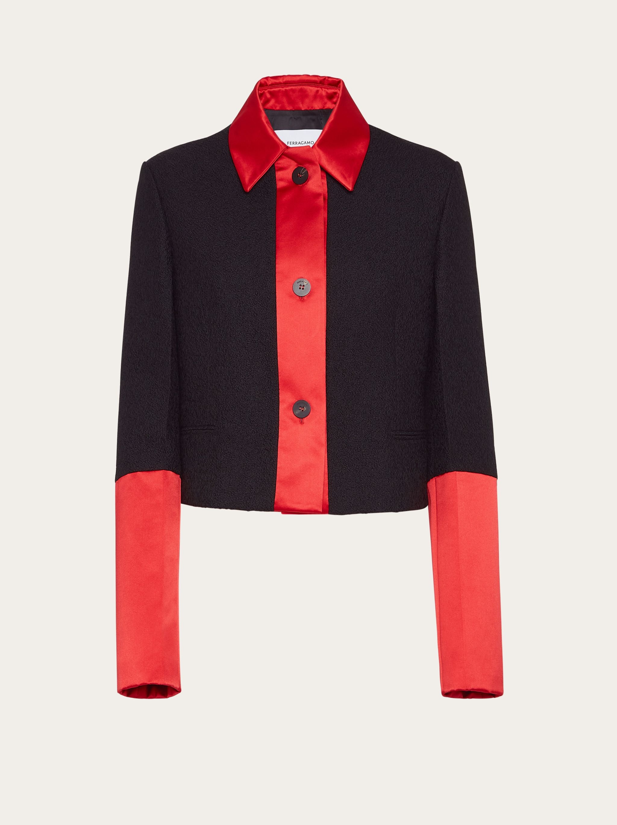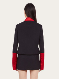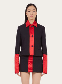 Cropped and contemporary, with bold inserts, this single breasted jacket is made from a blend of pure virgin wool. On the collar, along the placket and cuffs, color block satin inserts add a bold touch. Double welt pockets, custom horn buttons and shirt-like cuffs complete the design. Model measurements: Height 5' 10½ "/179 cm; Bust 32½ "/82 cm; Waist 23"/58 cm; Hips 34½ "/88 cm Model wearing: 38 - Composition: 48% pure virgin wool, 35% polyamide, 17% polyester - Product code: 13C552 763653 - Made in ITALY