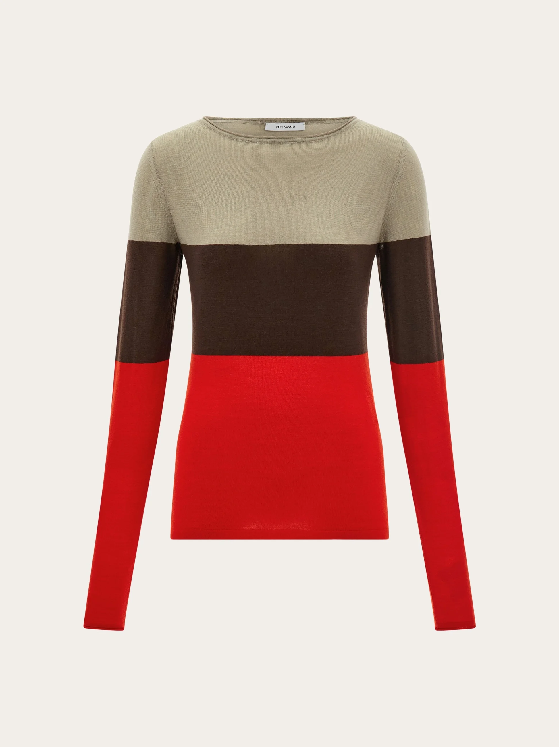 With a rolled hem and slim fit, this new block colors top is made of pure virgin wool. The soft fabric gently caresses the silhouette and features long sleeves, a boat neck with rolled hem, and a small custom metal tab at the back of the neck. - Composition: 100% pure virgin wool - Made in ITALY - Product code: 13H882 790840