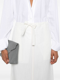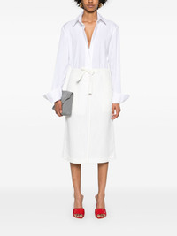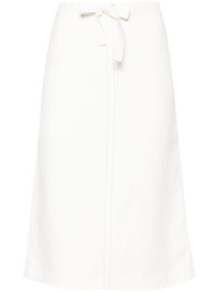 contrast-stitching drawstring midi skirt Highlights - Ivory white - Contrast stitching - Drawstring waist - Straight leg - Two side slit pockets - Two rear patch pockets - Rear slit - Straight hem - Below-knee length Made in Italy Composition Viscose 54%, Linen/Flax 46% SIZE & FIT Model measurements Height 5 ft 10 in(1.77 m) Bust/Chest 33.07 in(84 cm) Hips 37 in(94 cm) Waist 24.8 in(63 cm) FittingInformation This midi-length skirt is intended to be worn just below the waist Made from a midweight non-stretch fabric This piece fits true to size – take your usual size