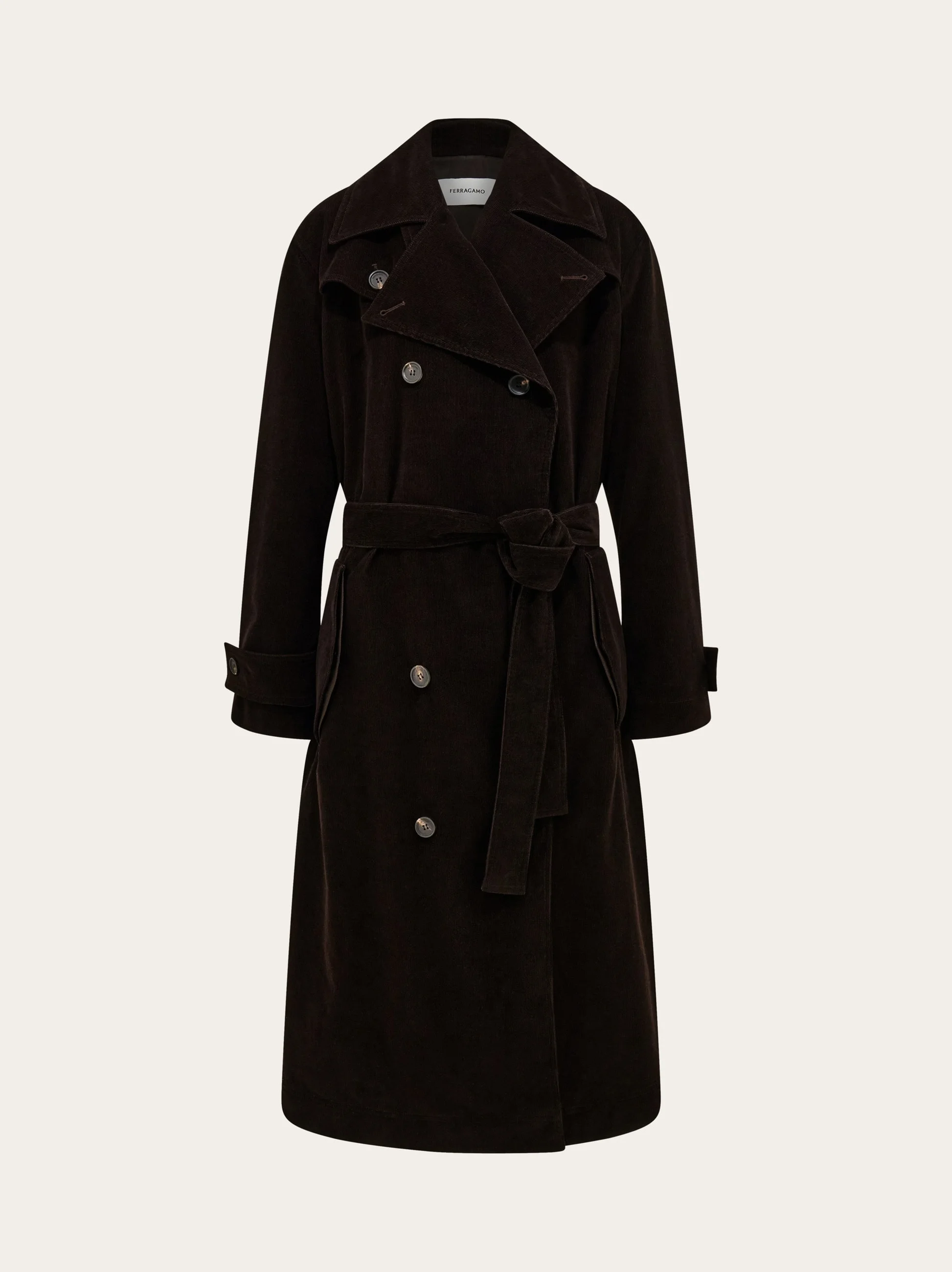 The coolest cover up of the season, in seventies-inspired corduroy. This new Ferragamo trench flaunts an impeccable construction, with button down storm flaps, and a tonal waist belt to cinch the silhouette. Wrist straps with signature diagonal eyelets and hip facing flap pockets complete the design. - Composition: 98% cotton, 2% elastane - Model measurements: Height 5' 9"/175 cm; Bust 30"/76 cm; Waist 24"/61 cm; Hips 34½"/87 cm - Model wearing: 38/XS - Made in ITALY - Product code: 13H371 785022