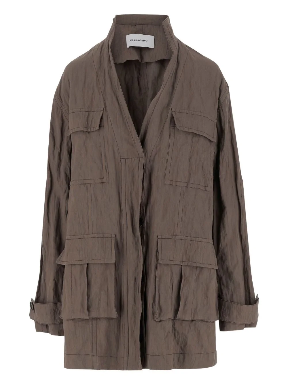 pocket-detail belted jacket Highlights - Brown - Two chest flap pockets - Two side flap pockets - Belted waist - Long sleeves Made in Italy Composition Cotton 84%, Metallic Fibre 16%