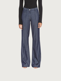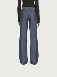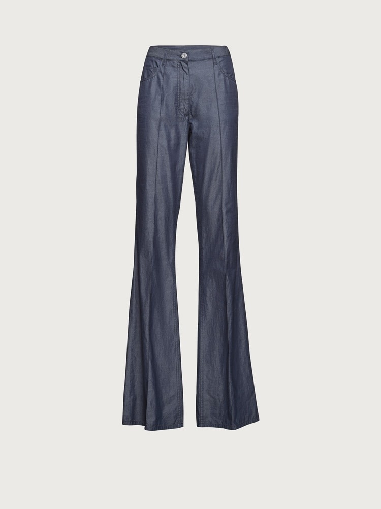 New cotton chambray trousers inspired by the classic five pockets, with high waist and tailored details such as the rib on the front and the flared cut leg. Super versatile, they work with many outfit combinations, adding a refined twist to laid back looks. Model measurements: Height 5' 11 "/180 cm, Bust 30½"/78 cm, Waist 23½"/60 cm, Hips 34½"/88 cm Worn size: 38 - Composition: 100% cotton - Made In ITALY