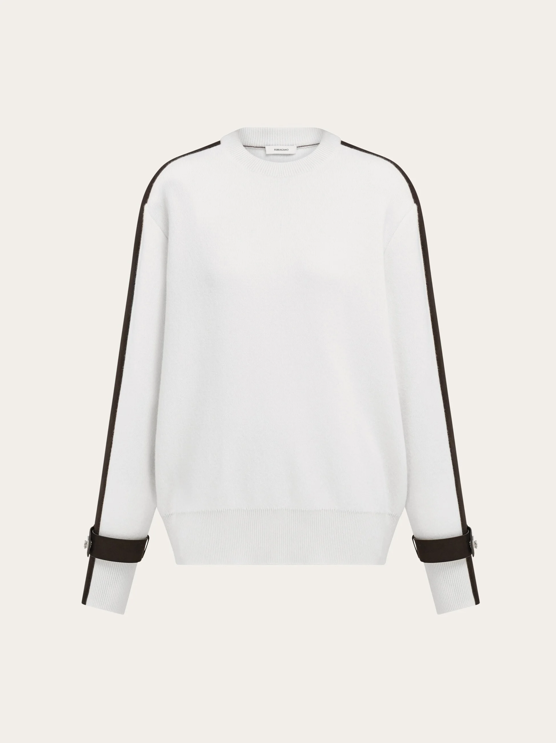 Clean lines and contrasting accents define the appeal of this cool new crewneck. Knitted from pure virgin wool it is detailed with suede-like Alcantara inserts. At the cuffs, the metallic Hug buckles add an urban twist to the trim which also runs along the length of the arm. Pair with the matching skirt for the full impact. - Composition: 100% pure virgin wool & Alcantara - Made in ITALY - Product code: 13H877 790970