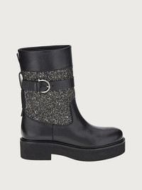 A strong, contemporary stride with something of a 90’s vibe. This chunky leather boot is made of soft Italian calf leather. The outline is clean and solid, with a rounded toe and an ultra-light rubber sole that offers comfort and elasticity. The removable strap, with Gancini buckle is covered with a pavé of micro crystals, adding a feminine touch to this gritty design. - Heel 1,5 cm - Composition: calf leather - Made In ITALY