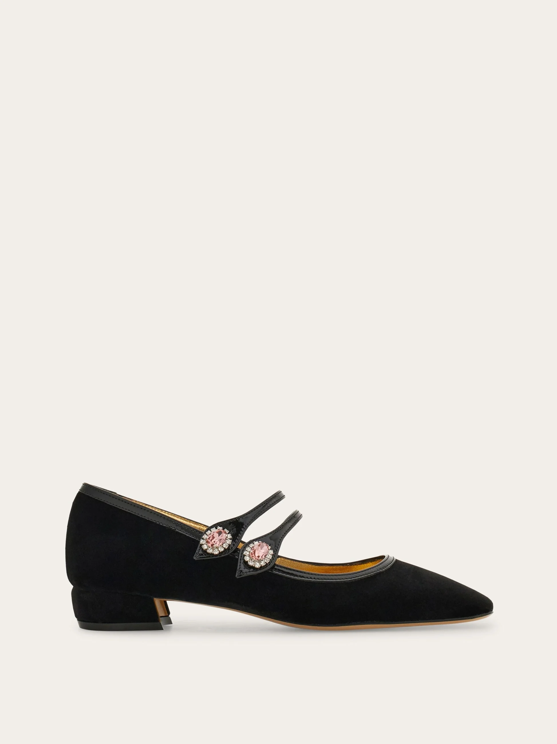 A fashion favorite re-edited in a high glam key. This new Mary Jane has a smooth velvet upper with two cabochon crystals on the patent straps. Patent trims and a squoval shaped toe complete the design. - Composition: fabric - Made in ITALY - Product code: 01K829 787855