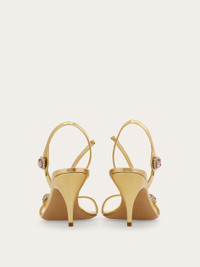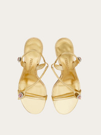 Showstopping sandal made from laminated calfskin leather with a beautiful golden glow. The sensual silhouette features three strategically placed straps adorned with flower-shaped cabochon crystals for an ultra-glam finish. The slim contoured heel recalls a shoe designed by Salvatore Ferragamo for Marilyn Monroe. - Composition: laminated calfskin - Made in ITALY - Product code: 01K849 787893