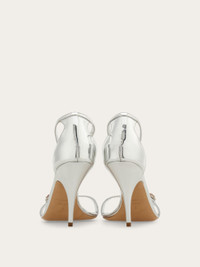Showstopping sandal made from laminated calfskin leather with a cool silver shimmer. The sensual silhouette features three strategically placed straps adorned with flower-shaped cabochon crystals for an ultra-glam finish. The slim contoured heel recalls a shoe designed by Salvatore Ferragamo for Marilyn Monroe. - Composition: laminated calfskin - Made in ITALY - Product code: 01K848 787882