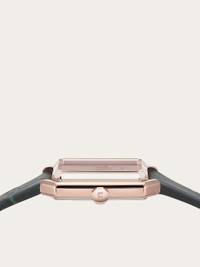 This feminine style introduces a new tank case with impactful geometric contours softened by bevelled angles and a diamond-cut sapphire glass that adds brightness and texture to the dial. <BR> <BR>Size: 26.5x33.5MM <BR>Movement: RONDA 762 - 2 hands quartz <BR>Case: IP rose gold <BR>Dial: Rose gold sunray dial <BR>Bracelet: Green calf lather alligator grain - Ardillon buckle with Ferragamo logo <BR>Glass: Sapphire crystal, anti-reflection, scratch-resistant <BR>WaterResistance: 30 meters <BR>2+2 Year Warranty <BR>Outer box, packaging, warranty and instruction booklet - Composition: Stainless steel and IP rose gold case, calf strap - Made in SWISS - Product code: 611294 772492
