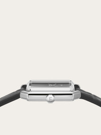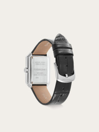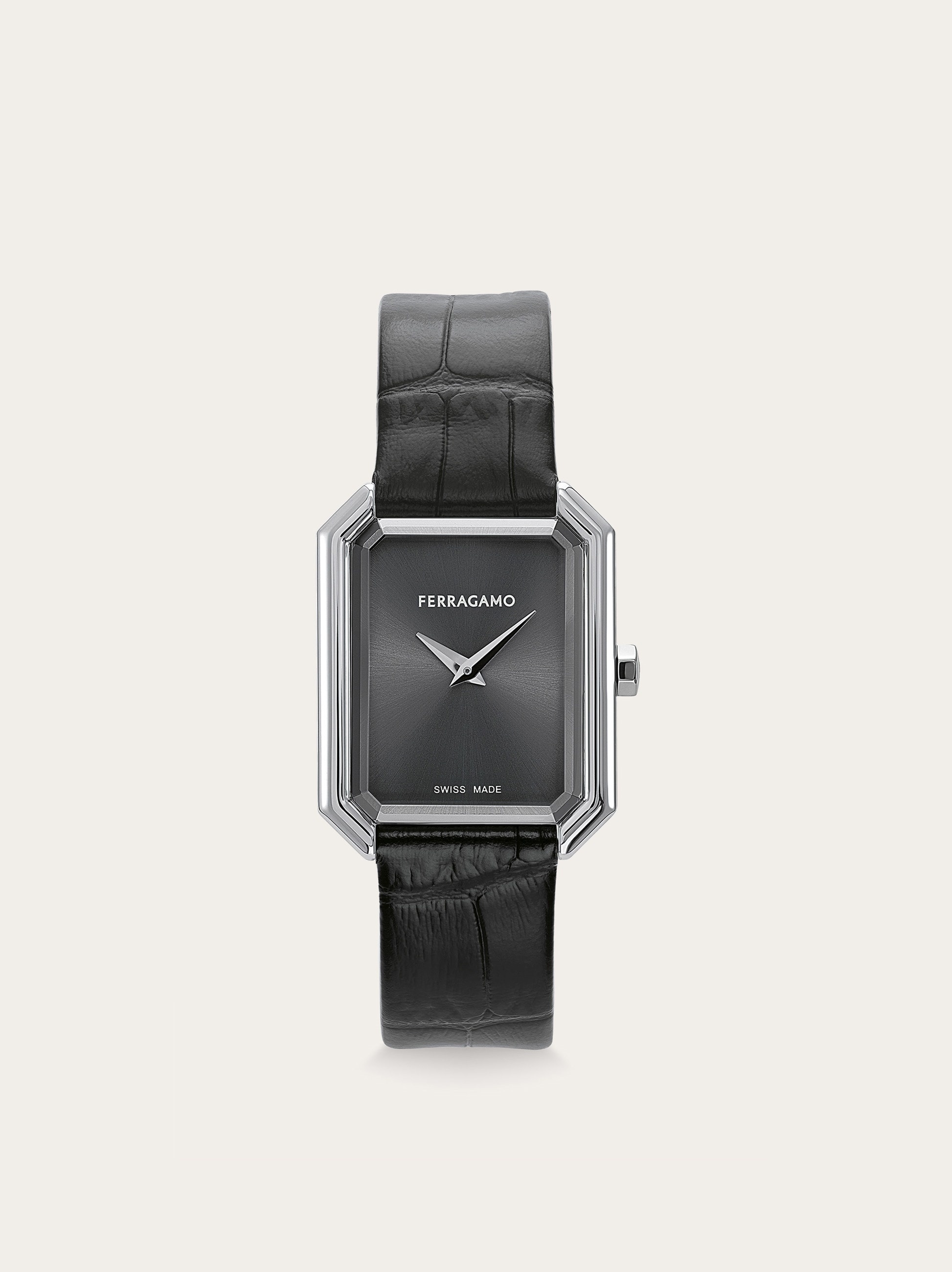 This feminine style introduces a new tank case with impactful geometric contours softened by bevelled angles and a diamond-cut sapphire glass that adds brightness and texture to the dial. <BR> <BR>Size: 26.5x33.5MM <BR>Movement: RONDA 762 - 2 hands quartz <BR>Case: Stainless steel <BR>Dial: Black sunray dial <BR>Bracelet: Black calf lather alligator grain - Ardillon buckle with Ferragamo logo <BR>Glass: Sapphire crystal, anti-reflection, scratch-resistant <BR>WaterResistance: 30 meters <BR>2+2 Year Warranty <BR>Outer box, packaging, warranty and instruction booklet - Composition: Stainless steel case and calf strap - Made in SWISS - Product code: 611294 772491