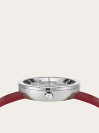 Ferragamo Curve reflects the aesthetic vision of creative director Maximilian Davis while enhancing and elevating the House’s distinctive balance between classic inspiration and modern edge. <BR> <BR>Size: 35 mm <BR>Movement: RONDA 753 - 3 hands quartz <BR>Case: Stainless steel <BR>Dial: Silver sunray with double Gancini index at 8h <BR>Bracelet: Red patent leather - Ardillon buckle with Ferragamo logo <BR>Glass: Sapphire crystal anti-reflection, scratch-resistant <BR>WaterResistance: 30 meters <BR>2+2 Year Warranty <BR>Outer box, packaging, warranty and instruction booklet - Composition: Stainless steel case and calf strap - Made in SWISS - Product code: 611306 773131