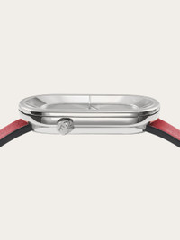 Ferragamo Curve reflects the aesthetic vision of creative director Maximilian Davis while enhancing and elevating the House’s distinctive balance between classic inspiration and modern edge. Size: 23 X 46 mm Movement: RONDA 751.2 - 2 hands quartz Case: Stainless Steel Dial: Silver sunray Bracelet: Red double tour calf leather strap - Ardillon buckle with Ferragamo logo Glass: Sapphire crystal, anti-reflection, scratch-resistant WaterResistance: 30 meters 2+2 Year Warranty Outer box, packaging, warranty and instruction booklet - Composition: Stainless steel case and calf strap - Product code: 611285 765972 - Made in SWISS